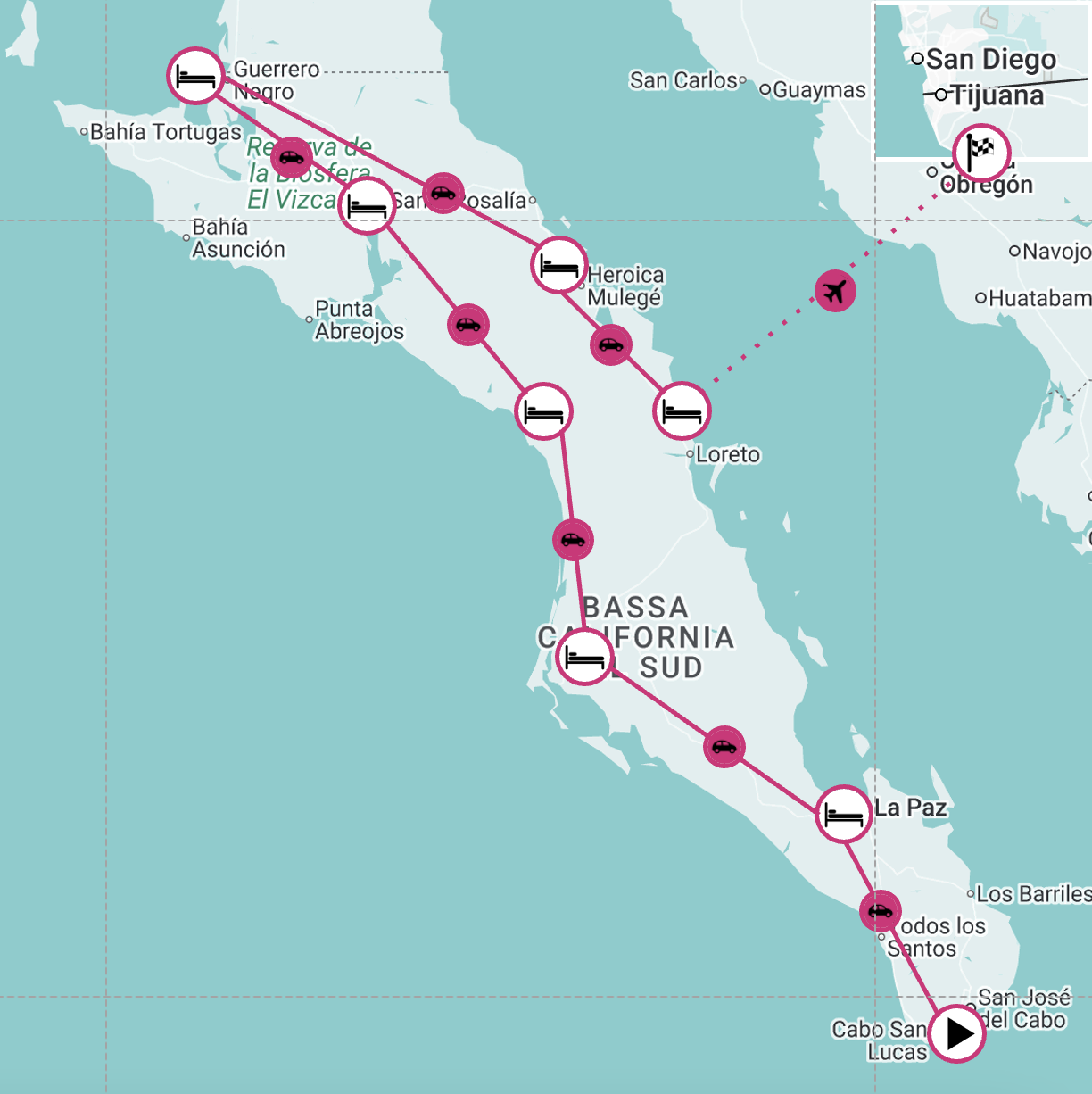 Partenza dall’Italia con volo internazionale notturno con scalo in direzione Cabo San Lucas, la città più a sud della Bassa California!
