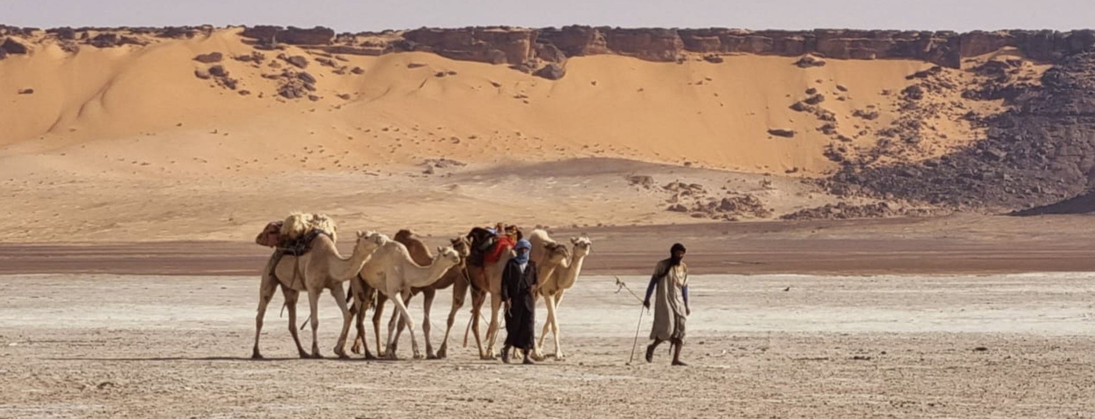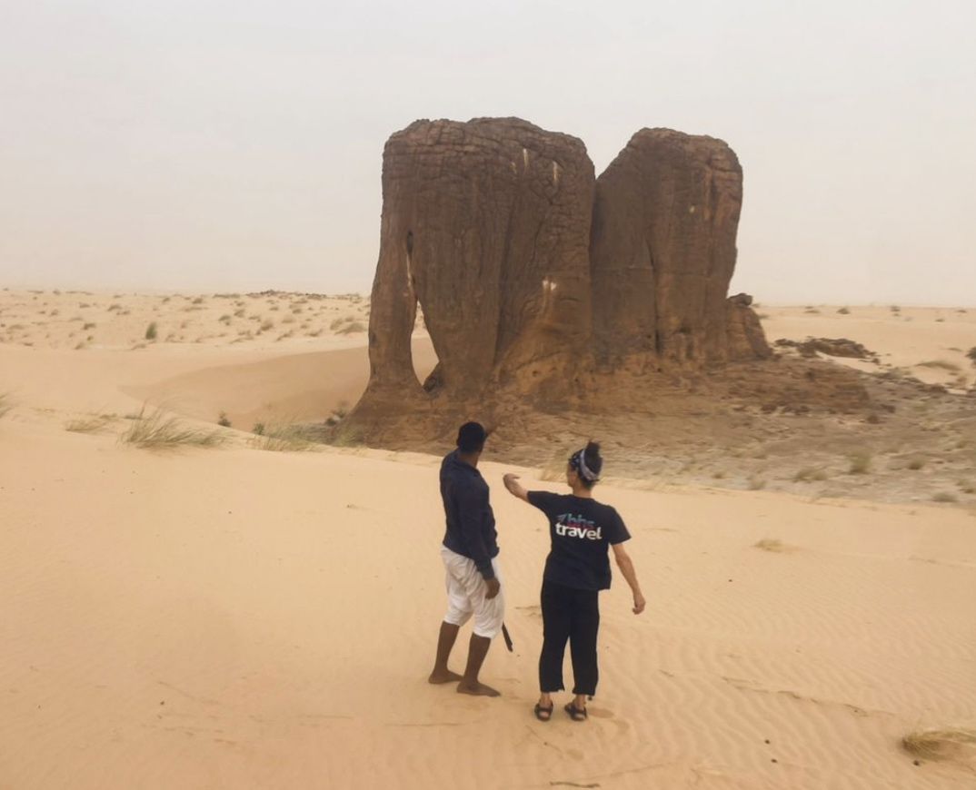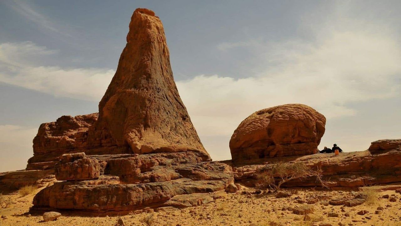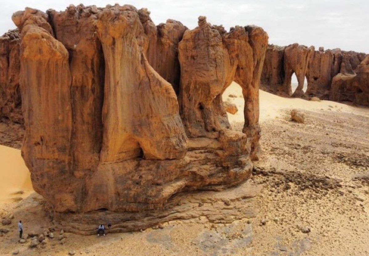 Mattina e pomeriggio:colazione e partenza lungo piste desertiche che attraversano altopiani rocciosi e grandi spianate di sabbia fine, arrivo nell’area di Mahkrougat, dove affiora la “Pietra dell’Elefante”, un’enorme formazione rocciosa modellata dal vento. Lungo la pista, si incontrano spesso carovane di cammelli carichi di sale dirette verso il nord