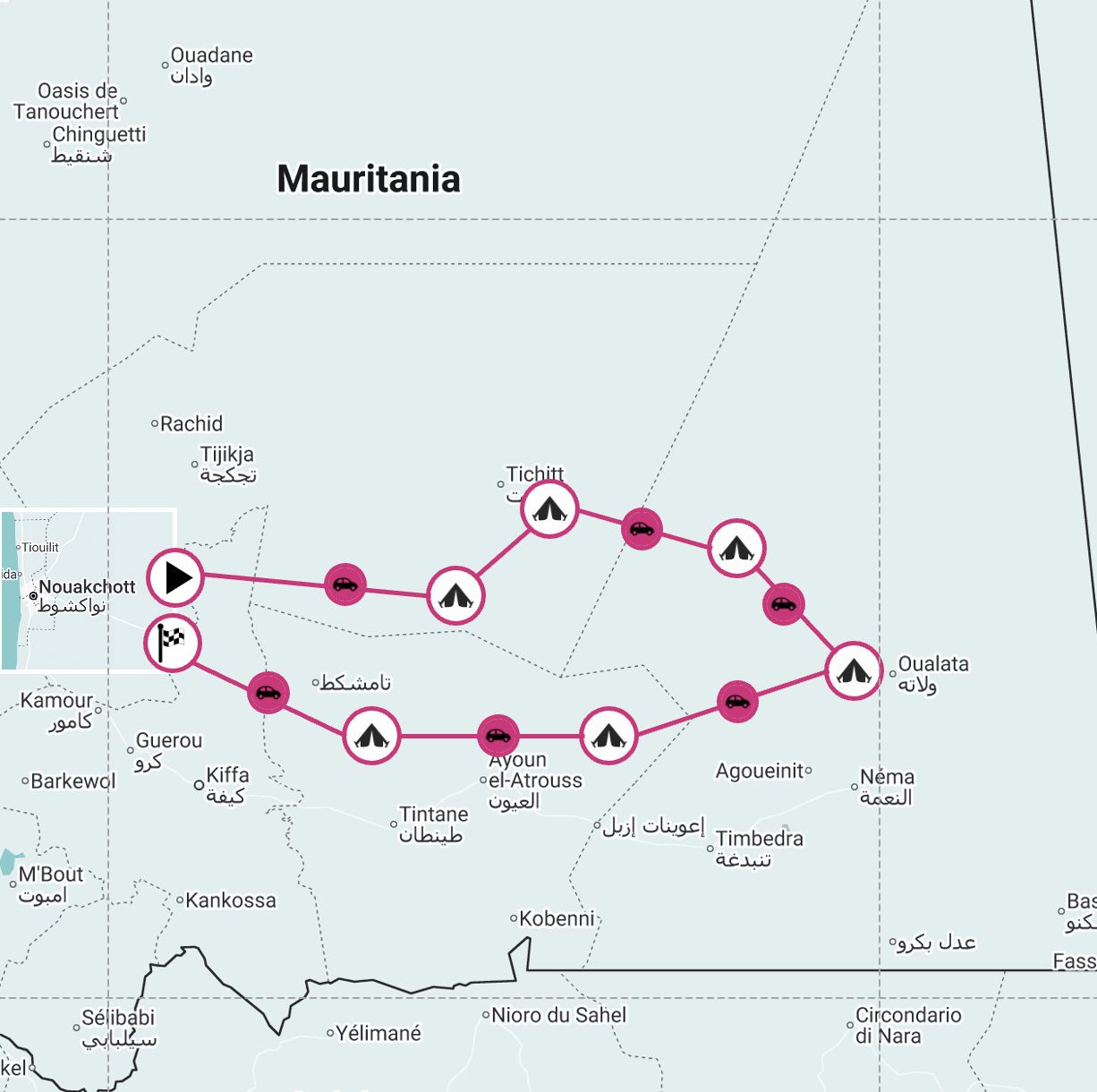 Un viaggio che attraversa il cuore più remoto del Sahara mauritano, tra altopiani di roccia nera, carovane del sale e città millenarie dimenticate dal tempo. Dalle sponde dell’Atlantico alle antiche vie carovaniere del Tagant, si percorrono piste infinite verso villaggi di fango e oasi isolate, fino a Oualata, la “Timbuctù mauritana”. Una spedizione densa di silenzi, sabbia e incontri autentici, dove la frontiera tra deserto e leggenda svanisce ogni giorno di più