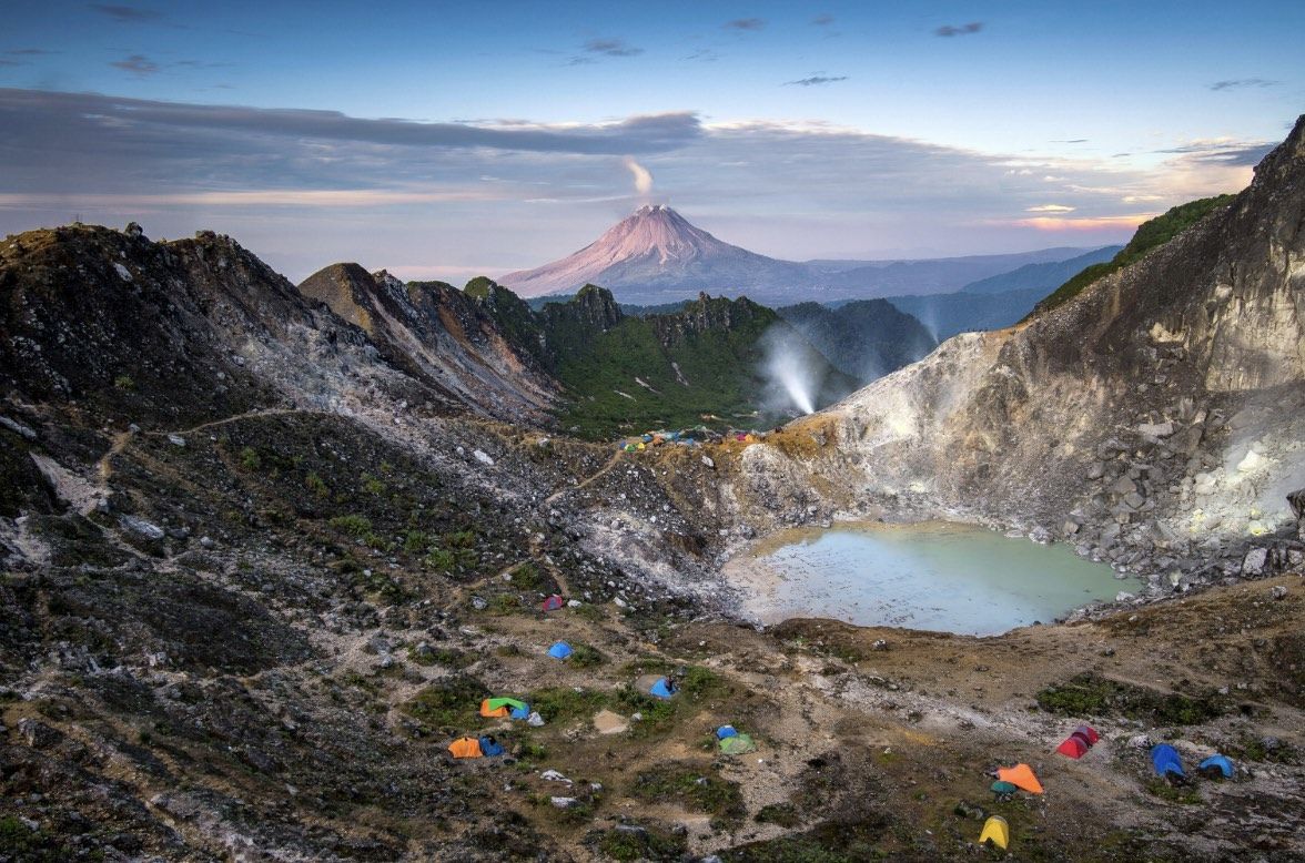 Pomeriggio: arrivo a Berastagi, cittadina di montagna dominata dai profili dei vulcani Sibayak e Sinabung. Dopo una breve sosta, trasferimento verso l’imbocco del sentiero che conduce al Monte Sibayak, preprandoci per un tramonto indimenticabile. Inizio della salita lungo un percorso che attraversa pendii rocciosi e tratti sabbiosi di origine vulcanica. Sistemazione in area camping nei pressi del cratere, in un ambiente suggestivo dominato da fumarole attive e vapori sulfurei. Nel caso in cui le condizioni climatiche mon lo permettano, si resterà a dormire in hotel a Berastagi e il trekking verrà svolto la mattina seguente (day 8) all’alba