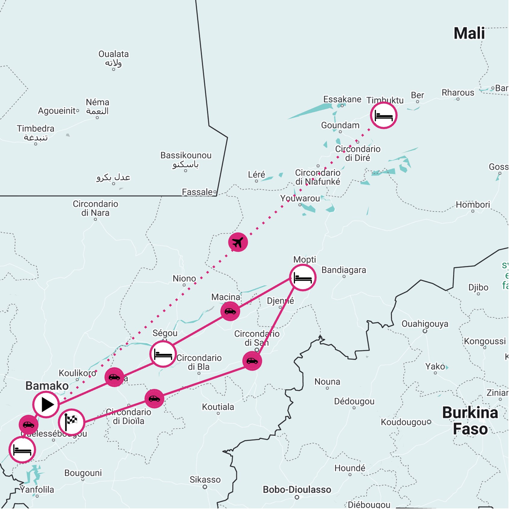 La situazione della sicurezza interna del Mali è estremamente volatile, e la lista di regioni considerate sicure può cambiare nel giro di brevissimo tempo. Pertanto l’itinerario potrà subire variazioni nelle settimane precedenti al viaggio e anche nel corso del viaggio stesso, se i referenti locali lo riterranno necessario